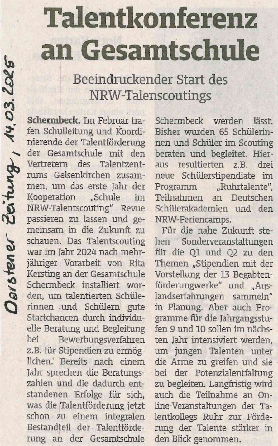 Die Gesamtschule Schermbeck ist die weiterführende Schule für Schermbeck und genießt großes Vertrauen bei Eltern und Schülerinnen und Schülern aus Schermbeck und den umliegenden Kommunen. Die Schülerinnen und Schüler aus Dorsten, Raesfeld, Kirchhellen, Marienthal usw. haben bei der Anmeldung dieselben Chancen zur Aufnahme wie diejenigen aus Schermbeck. Immer wieder auftretende Gerüchte, die etwas anderes behaupten, sind einfach falsch.